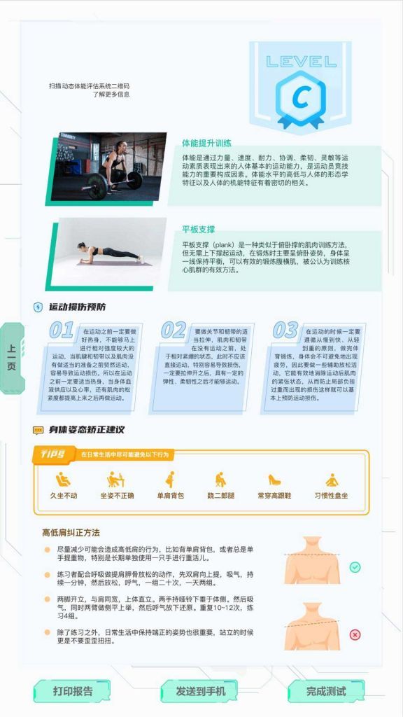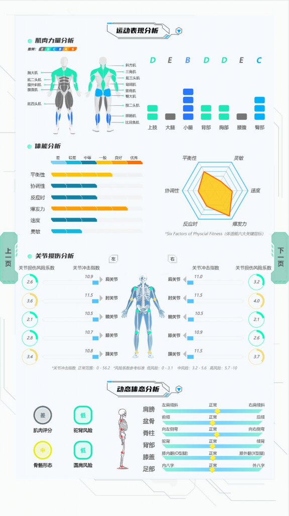 綜合體能測(cè)試:體能8項(xiàng)檢測(cè),反應(yīng)測(cè)試、原地跳躍、仰臥起坐、俯臥撐、高抬腿、立位體前屈、單腿站立、原地快跑。結(jié)合全新的數(shù)據(jù)算法,對(duì)各項(xiàng)測(cè)試進(jìn)行綜合評(píng)分,反映身體發(fā)展?fàn)顟B(tài),通過(guò)這些項(xiàng)目的測(cè)試評(píng)估身體的綜合體能情況。